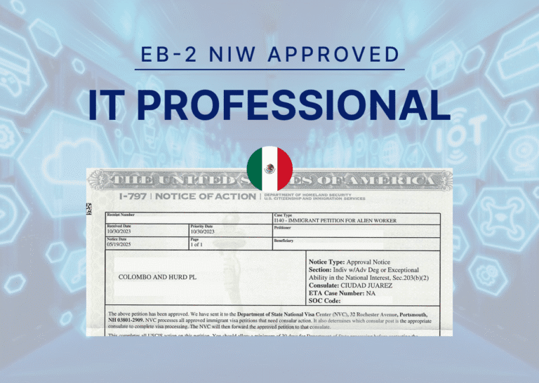 This case was handled by Attorney Yadira Aguilar of Colombo & Hurd, a U.S. immigration law firm specializing in employment-based green cards including EB-2 NIW and EB-1A petitions. The firm has secured over 10,000 successful visa and green card approvals for clients from more than 100 countries, including more than 2,500 approvals in EB-2 NIW and EB-1A categories since 2023.